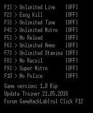 Версия трейнера под Рип от Механиков - так как нет не одного трейнера к ним из за не совпадения процесса игры. А процесс там "Wheelman.exe" а не как в EN "WheelmanGame-Final.exe" а переименование файла игры не чего не даст. Игра просто не запустится и всё.