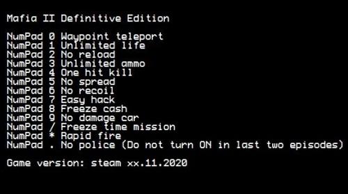 Ps: В архиве идут два трейнера, на первую и вторую часть. Отличие в них одно, а это последняя функция. В первой части за место "Убийства с одного выстрела" сделана скорострельность.