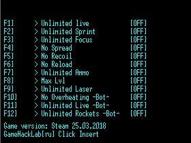 Без отдачи (Убирает отдачу у всего оружия) Точность 100% (Все пули летят в 1 точку) Супер урон (Повышает наносимый урон каждой пули в 10 раз) Скрыть ники (Скрывает ваш ник, ники союзников и противников. Вы будете показываться как ADMIN, все остальные как BOT. В списке игроков, не будет видно НИКОГО) Антислепа (Убирает эффект светошумовых гранат) Подсад (Вы сможете забираться на любые возвышенности, без помощи напарника, там где это возможно в игре) Длинный подкат (Сможете подкатываться через полкарты) Бесконечные патроны (Патроны никогда не заканчиваются) Кик с ПВЕ (Сможете исключить ЛЮБОГО союзника с ЛЮБОЙ миссии или Спецоперации, в ЛЮБОЙ момент) ЕСП:
