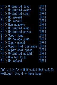 Силуеты (Обводит противников в определенный цвет, в зависимости от видимости ) Линии (показывает линии от вашего прицела до противников) Взрывчатка (Позволяет видеть установленные мины, а также гранаты летящие в вас) Аимбот:
