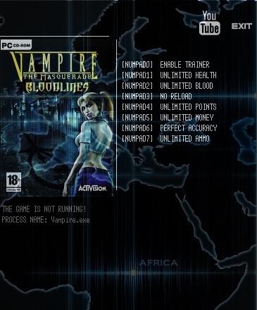 Запускаскаем игру, потом запускаем трейнер и активировав жмем клавиши интересующих опций. Функции трейнера: [0] Активация трейнера. [1] Бессмертие. [2] Бесконечная кровь. [3] Бесконечные очки на прокачку персонажа. [4] Без перезарядки оружия. [5] Бесконечные деньги. [6] Точность - тестирована только на револьвере. [7] Бесконечные патроны. Версия игры - наверное на любой пойдет. DEMO3 балла