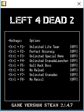 Использование: Скаченный архив распаковываем в любое удобное для вас место. Запускаем игру и в меню игры или после как начали игрыть - запускаем трейнер и жмем нужные клавиши. Функции трейнера: [0] Бесконечная жизнь всей команды. [1] Максимальная точность оружия. [2] Бесконечные спец патроны. [3] Без перезарядки гранатомета. [4] Включить показ Боссов на карте. [5] Без перезарядки оружия. [6] Бесконечные гранаты. [8] Без отдачи оружия. PS: Саму dll а то есть чит - можно любым своим инжектором инжектить. Тем же СЕ. Это написал к тому, что не которые с Авастами пишут мне - мол в инжекторе вирус и так далее. А это есть возможность своим инжектить - (который без вируса) В видео показано как это делать.3 балла -