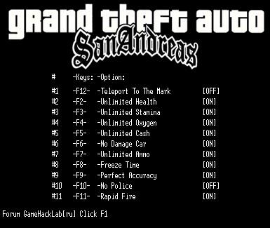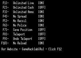 Запускаем игру, запускаем трейнер - это тот, что cpl Функции: Бесконечная жизнь. Бесконечные деньги. Бесконечные патроны. Максимальная точность оружия. Без отдачи оружия. Без полиции. Телепорт. Без перезарядки оружия.. Хотел встроить её в патроны, передумал, переписывать было лень функции - добавил в самый низ её. Demo:3 балла -