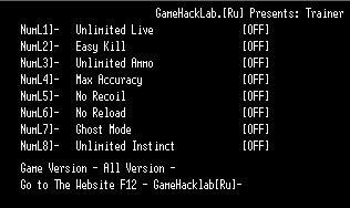 Использование: Запускаем игру, запускаем трейнер - это тот, что в архиве в расширении cpl и жмем нужные клавиши. Функции трейнера: Бесконечная жизнь. Быстрое убийство. Бесконечные патроны. Максимальная точность оружия. Без отдачи оружия. Без перезарядки оружия. 100% не видимость. Бесконечный инстинкт. Demo:4 балла -