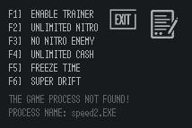 Использование: Запускаем игру, а потом трейнер - активируем первой опции и далее уже на выбор функции. Функции: Бесконечные нитро. Противники без нитро. Бесконечные деньги. Заморозка времени. Супер дрифт. PS: Забыл добавить функцию не ломаемого движка. Но время замораживаем и все противники стоят на месте... Так можно и первым приехать и заморозить их и так далее. Они по времени ориентируются, а если его нет - они теряются в управлении. Если у игры процесс другой - то изменяем "exe" файл в папки с игрой под процесс и играем.3 балла -