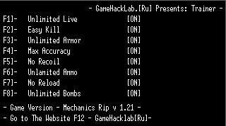 Использование: Скаченный архив распаковываем в любое удобное для вас место. Запускаем игру, запускаем трейнер - это тот, что "cpl" Функции Трейнера: [F1] Бесконечная жизнь. [F2] Убийство с 1 выстрела. [F3] Бесконечная броня. [F4] Максимальная точность. [F5] Без отдачи оружия. [F6] Бесконечные патроны. [F7] Без перезарядки оружия. [F8] Бесконечная взрывчатка. PS: Так же можно супер урон сделать - скорострельность оружия, но с функцией Easy Kill это всё на вряд ли надо. Demo:3 балла -