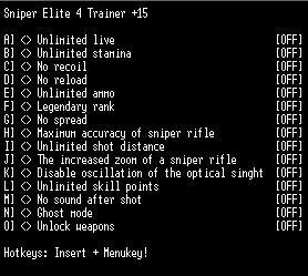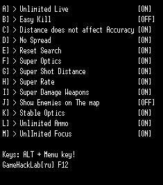 Использование. Запускаем игру, запускаем в меню игры или в самой игре трейнер. Функции: Бессмертие. Быстрое убийство. Без воздействия расстояния на выстрел. Точность. Быстрый сброс детекта... С глаз врага ушли и всё. Супер приближение оптики. Скорострельность. Супер урон по врагам. Показ врагов на карте. Оптика без колебания. Бесконечные патроны - гранаты. Бесконечный фокус. Demo:4 балла -