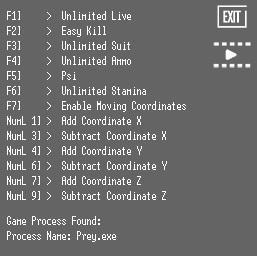Использование: Скаченный архив распаковываем в любое удобное для вас место. Запускаем игру, запускаем трейнер. Функции Трейнера: 1) Бесконечная жизнь. 2) Быстрое убийство. 3) Бесконечный костюм. 4) Бесконечные патроны - предметы. 5) Psi 6) Бесконечная выносливость. 7) Включение перемещения по координатам. В общем функция эта, что бы через стенки бегать.. Управление на Numlock Demo:3 балла -