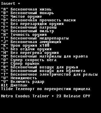 Использование: Запускаем сначала игру, а в главное меню игры (либо в уже начатой игре) запускаем трейнер. Функции в трейнере парные, зажимаем insert и жмем клавиши указанные на панели трейнера. Функции: 1. > Бессмертие. 2. > Бесконечный фонарь. 3. > Чистое оружие. 4. > Долговечность маски. 5. > Без перезарядки оружия. 6. > Бесконечные патроны. 7. > Бесконечное время фильтров. 8. > Точность оружия. 9. > Бесконечные аптечки. 10. > Бесконечные бомбы, ножи. 11. > Урон по мутантам увеличен в 100 раз. 12. > Без отдачи оружия. 13. > Без перегрева оружия. 14. > Бесконечные предметы на крафт. 15. > Супер бег. 16. > Супер прыжок. 17. > Бесконечный воздух для ружья. 18. > Бесконечный воздух для пулемета. 19. > Враги не атакуют. 20. > Возможность летать с зажатой клавишей Alt4 балла -
