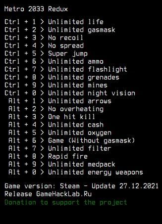 Использование: Запускаем сначала игру, а в главном меню игры (либо в уже начатой) запускаем трейнер Функции: Бесконечная жизнь Бесконечный противогаз Без отдачи оружия Точность оружия Супер прыжок Бесконечные патроны Бесконечный фонарь Бесконечные гранаты Бесконечные мины Бесконечная энергия прибора ночного видения Бесконечные стрелы Без перегрева оружия Убийство с одного выстрела Бесконечные деньги Бесконечный воздух для оружия Возможность играть без противогаза. Одели, сняли и играете Бесконечный фильтр Скорострельность оружия Бесконечные аптечки Бесконечная энергия для электро-оружия3 балла -