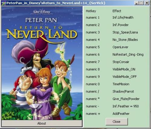 Игра: Peter Pan in Disney's Return to Never Land Трейнер сделан и проверен: Windows XP , 7-x32, 64 Версия: не известно Описание игры: Фуниции: Numpad_1 - Inf.Life/Health Numpad_2 - Inf.Powder Numpad_3 - Stop_Spear/Liana Numpad_4 - No_Stone /Blades Numpad_5 - OpenLever Numpad_6 - NoRestart_Ding -Ding Numpad_7 - StopCorsair Numpad_8 - VisibleMode_ON Numpad_9 - VisibleMode_OFF Numpad_0 - TimeMission Numpad_/ - Shadow/Parrot Numpad_* - Give_Flute/Powder Numpad_- - Inf.Feather = 950 Numpad_+ - AddFeather Пояснение к функциям: