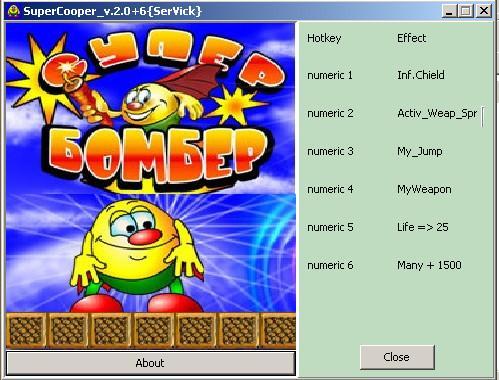 SuperCooper v.2.0 +6 Просмотр файла Описание: Функции: Numpad_1 - Inf.Chield Numpad_2 - Activ_Weap_Spr Numpad_3 - Jump Numpad_4 - MyWeapon Numpad_5 - Life => 25 Numpad_6 - Many + 1500 Пояснение функций: Руслан (Xipho), благодарю за помощь со скриптом. Видео-трейнер Добавил SerVick Добавлено 28.04.2021 Категория Трейнеры для PC игр