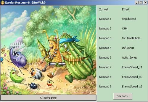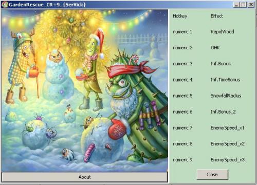 Игра: Garden Rescue 2: Christmas Edition / Защитники сада: Новогодний переполох Функции: Numpad_1 - RapidWood Numpad_2 - OHK Numpad_3 - Inf.Bonus Numpad_4 - Inf.TimeBonus Numpad_5 - SnowfallRadius Numpad_6 - Inf.Bonus_2 Numpad_7 - EnemySpeed_x1 Numpad_8 - EnemySpeed_x2 Numpad_9 - EnemySpeed_x3 Пояснение: -