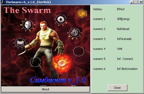 Игра: Симбионт / The Swarm Версия: 1.0 Функции: Numpad_1 - GM&Energ - (неубиваемость ГГ и беск. энергия) Numpad_2 - NoReload - (без перезарядки оружия) Numpad_3 - Inf.Granade - (беск. гранаты) Numpad_4 - OHK - (убийство с 1 выстрела/удара) Numpad_5 - Inf. Connect - (беск. соединения) Numpad_6 - Inf.Bioformation - (беск. биообразование) Пояснение: -