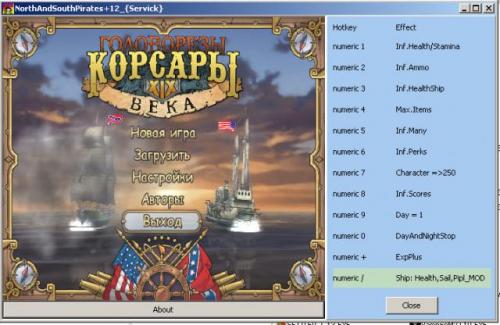 Игра: North and South Pirates Названия: North and South Pirates / Swashbucklers: Blue vs. Grey / Головорезы: Корсары XIX века Трейнер + 12 и (мод - файлы) Описание: (полное описание в архиве) Numeric 1 - Inf.Health/Stamina (Беск. здоровье/энергия) Numeric 2 - Inf.Ammo (Беск. патроны, заряды коробля) Numeric 3 - Inf.HealthShip (Беск. здоровье корабля (только для "Алабамы")) Numeric 4 - Max.Items (Беск. предметы 3000шт. при продаже / покупке ) Numeric 5 - Inf.Many (Беск. деньги 100000 покупка/продажа) Numeric 6 - Inf.Perks (Беск. перки ) Numeric 7 - Character =>250 (уровень характеристик) Numeric 8 - Inf.Scores (Беск. очки) Numeric 9 - Day = 1 (сброс/заморозка 1 -ый день) Numeric 0 - DayAndNightStop (Остановка времени суток) Numeric + - ExpPlus (ускоренный подъём уровней) Numeric / - Ship: Health,Sail,Pipl_MOD - (восстановление здоровье корабля, парусов, количества людей на глобальной карте)