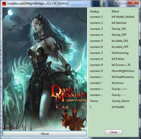 Dark Messiah of Might and Magic Версия игры 1.2 Репак Numeric_1 = Беск. жизнь (???) Numeric_2 = Беск. стамина Numeric_3 = Вкл. хождение сквозь стены Numeric_4 = Выкл. хождение сквозь стены Numeric_5 = Вкл. невидимость Numeric_6 = Выкл. невидимость Numeric_7 = Нет отравления Numeric_8 = Беск. зелья Numeric_9 = Беск. очки навыков = 20 Numeric_0 = Мягкое ночное зрение Numeric_/ = Беск. жизнь Леаны Numeric_* = Беск.стрелы Numeric_+ = Увеличение гравитации Numeric_- = Уменьшение гравитации Home_____= Номальная гравитация ] __________= Беск. жизнь -