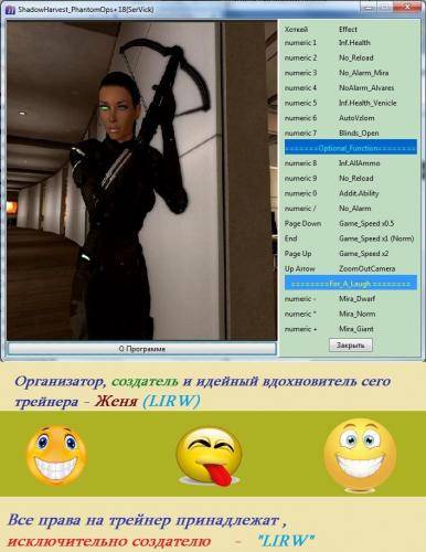 Игра название: Shadow Harvest - Phantom Ops Данные об игре на которой делался трейнер: Описание функций: Numpad_1 - Inf.Health (Беск. жизнь) Numpad_2 - No_Reload (без перезарядки) входят следующие функции: а) - No_Reload - Без перезарядки б) - NightVision - Беск. режим ночного видения в) - Addit.Ability - Беск. режим доп. способности г) - NoFire - пламягаситель (нет пламени оружия) д) - Accuracy - Точность е) - No_Reload_Claws - Без перезарядки когти ё) - Inf.Grenades - Беск. гранаты Numpad_3 - No_Alarm_Mira - нет тревоги Мира Numpad_4 - NoAlarm_Alvares - нет тревоги Альварес Numpad_5 - Inf.HealthVenicle (объединено) а) - Inf.HealthAuto - Беск. здоровье машины б) - Inf.Heal(БВХ) - робот в) - NoOverCheat - нет перегрева пулемёта Numpad_6 - AutoVzlom - автовзлом замков, установки динамита.) Numpad_7 - Blinds_Open - открытая створка жалюзей Опциональные функции: (кому не нужны в функции "No_Reload" пункты "Б-Ё") Numpad_8 - Inf.AllAmmo - Беск. боезапас Numpad_9 - No_Reload - Без перезарядки Numpad_0 - Addit.Ability - Беск. доп. способность Numpad_/ - No_Alarm - Не появляется индикатор тревоги и быстрый сброс подозрения Page_Down - Game_Speed x0.5 - скорость игры уменьшается в 2 раза End - Game_Speed x1 - нормальная скорость игры Page_Up - Game_Speed x2 - скорость игры увеличивается в 2 раза Up_Arrow - ZoomOutCamera -отдалить камеру от ГГ. Функции для прикола: Numpad_- - ГГ. карлик Numpad_* - ГГ. норм Numpad_+ - ГГ. великан подробное описание в архиве Всем приятной игры! Если не заморачиваться на графике.., мне игра понравилась..? -
