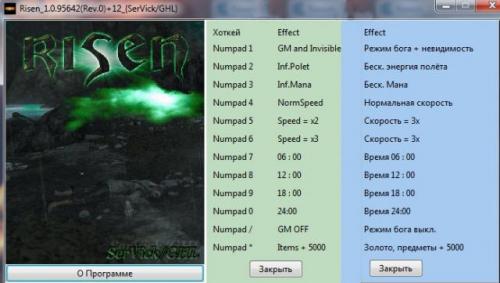 Трейнер: Risen v_1.0.95642+12 Требуется: Cheat Engine 6.7 или выше Скачать можно: тут Работа трейнера: Risen_Chit Numapd1 - Режим бога и невидимость (отключать для разговора с НПС, иначе они вас не будут видеть, невидимы если вы не нападаете, потерянное здоровье до включения функции не восстанавливается, пользуйтесь зельем) Numapd2 - Бесконечная энергия полёта (требуется свиток "Левитация", теперь не доступных мест не будет, подниматься можно на любую высоту (не забываем включить режим бога, чтоб не разбиться при отключении "Левитации"), правда если слишком высоко подняться то перс будет ходить по стеклянному полу и проблематично спуститься вниз...) Numapd3 - Беск. мана (при заклинания мана не расходуется) Numapd4 - Нормальная скорость передвижения Numapd5 - Быстрая скорость передвижения Numapd6 - Супер скорость (не рекомендуется при передвижении по земле особенно когда перс бежит по склону/с горы вниз, страшного ничего не будет просто перс будет постоянно прыгать с высоты т.к. игра не успевает прорабатывать бег (попробуйте), делал для быстрого перемещения "Левитация") Numapd7 - Установить время 06:00 Numapd8 - Установить время 12:00 Numapd9 - Установить время 18:00 Numapd0 - Установить время 24:00 Numapd/ - Отключить режим бога (предварительно отключаем Numapd1) Numapd* - +5000 предметов/золота (при поднятии/взятии из сундука/использовании любых предметов/стрел/зелий, не жадничайте делайте не более 30000 иначе будет не корректно отображаться, сделали сколько вам надо и отключили чит, золота сколько угодно можете делать (хотя оно особо в игре не нужно, тем боле всегда куча вещей под рукой для продажи)) В видео сразу бежим и забираем свиток "Левитация". И всё, не знаем преград -