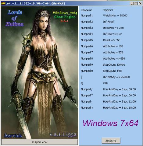 Lords of Xulima - Deluxe Edition (2014) (Steam-Rip от Let'sPlay) PC Версии игры 2.1.1.1352 Примечание: 1) Трейнер делалался и проверялся на Вин. 7х64 2) Функции включаются после выполнения действия. Т.е. использовали/продали зелье, или какой другой предмет, только после этого включится функция №3(В инвентаре должно быть не менее 2 -х предметов данного типа), или передвинулись по локации после этого включится функция №2 и т.д.. Т.е. должен сработать оригинальный код. Потратили одно очко улучшений, только после этого включится функция №4. Описание функций: 1) Numeric - 1 WeightMax = 50000 (Максимальный вес) 2) Numeric - 2 Inf.Fuud (Беск. макс -ый запас корма) 3) Numeric - 3 ItemsMin => 250 (Беск. минимальное колич -во предметов. ) 4) Numeric - 4 Inf.Scores = 22(Бесконечные очки навыков) 5) Numeric - 5 Resist => 350 (Сопротивление огню/холоду и т.д., требуются ингридиенты 1 раз для каждого вида сопротивления ) 6) Numeric - 6 Attributes = 100(Установка атрибутов на указанное значение(сила,ловкость и т.д., срабатывет в меню улучшений при сбросе атрибута. смотри видео.)) 7) Numeric - 7 Attributes = 555(Установка атрибутов на указанное значение) ?Numeric - 8 Attributes = 888(Установка атрибутов на указанное значение) 9) Numeric - 9 StopCount Elektro (откл. счёта шагов "электопушек") 10) Numeric - 0 StopCount Fire (откл. счёта шагов"огнеморд") 11) - ] Inf.Money => 250000(Беск. деньги, не тратятся при покупке) 12) - Q OHK(Убийство врагов с одного раза. Не зависит нападает отряд ГГ, или враги. Юнит отряда ГГ получает дефолтный урон, если атакует враг(включать. только во время боя, после боя отключить..)) 13) Numeric - / HourAndDay = 3 дн. 00:00(Установка и остановка времени и дня(при вкл. функции время замораживается)) 14) Numeric - * HourAndDay = 3 дн. 06:00(Установка и остановка времени и дня) 15) Numeric - - HourAndDay = 3 дн. 12:00(Установка и остановка времени и дня) 16) Numeric - + HourAndDay = 3 дн. 18:00(Установка и остановка времени и дня) Работа трейнера -