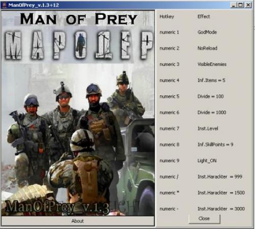 Man of Prey (Мародер)_v.1.3 Просмотр файла Описание: Верисия игры 1.3 Активация: Запустить игру, свернуть (Alt+Tab), запустить трейнер, нажать клавиши нужных функций 1) Numeric 1 - Режим Бога(включить после активации одной из последних 3-х функций для восстановления здоровья, а то перс будет без сознания, в дальнейшем не особо нужная функция) 2) Numeric 2 - Без перезарядки ( вставленно много скриптов другого рода относящихся к оружию чтоб меньше кнопок задействовать, как то перегрев, длинная очередь в автоматическом, или дуплет -режиме оружия и т.д., по умолчанию в игре одиночный и 3-и патрона очередь.., мощный дуплет у двустволки получается..) 3) Numeric 3 - Видимость врагов (враги в игре видны при передвижении и стрельбе на близком расстоянии, чит делает видимыми на всей локации) 4) Numeric 4 - Беск. предметы = 5 (нужна в основном, чтоб гранаты не заканчивались) 5) Numeric 5 - Деление предметов (в основе для патронов нужно т.к. патроны вместо денег ещё используются. В инвентаре при делении получается 2 х 100, колличество при разделении не важно) 6) Numeric 6 - (тоже, что и фунция 5, только по 2 х 1000) 7) Numeric 7 - Быстрый уровень (при каждом получении 1 очка опыта поднимается уровень) ? Numeric 8 - Беск. очки навыков = 9 9) Numeric 9 - Вкл. свет (надо в принципе в одном месте в бункере, не удобно искать рубильник в игре при оригинальном свете) 10)Numeric / - Быстрый подъём навыков на указанное значение в функции (просто включить нужную функцию, потом можно выключить (сила,ловкость и т.д.)) 11)Numeric * - (Тоже, что и 10-я функция, только значение больше) 12)Numeric - - (Тоже, что и 10-я функция, только значение больше) Добавил SerVick Добавлено 05.09.2020 Категория Трейнеры для PC игр