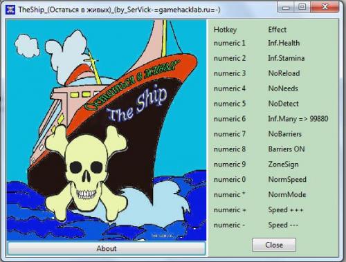 Тренер: The Ship (остаться в живых) +12 (для офф.лайн игры) Запускаем игру, запускаем трейнер Требуется: Cheat Engine 6.7 или выше Описание функций: Numpad1 - Беск. жизнь Numpad2 - Беск. стамина Numpad3 - Без перезарядки Numpad4 - Нет потребностей Numpad5 - Нет обнаружения камерами, охраной (если не нападаете без задания на убийство..) Numpad6 - Беск. деньги (наличные/в банке по 99880) Numpad7 - Хождение сквозь стены Numpad8 - Отключить хождение скв. стены Numpad9 - Знак запрет. зоны (оставил не стал объединять с невидимостью, чтоб видеть запрет.зоны, можно включить появляться не будет) Numpad0 - Нормальная скорость (отключать, когда надо увеличивать/уменьшать скорость) Numpad+ - Увеличение скорости передвижения по 1 нажатие на 0.1х Numpad- - Уменьшение скорости (можно до полной остановки перса) Информация об игре: -