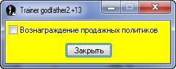 Godfather 2 Просмотр файла Описание. Запустить игру, активировать чит кликом на чекбокс, чит сработает сразу же как вы выполните хотя бы одно условие для каждого вознаграждения, у разных продажных политиков. Добавил LIRW Добавлено 04.09.2020 Категория Трейнеры для PC игр