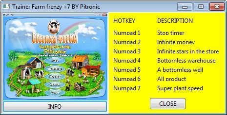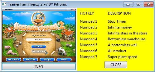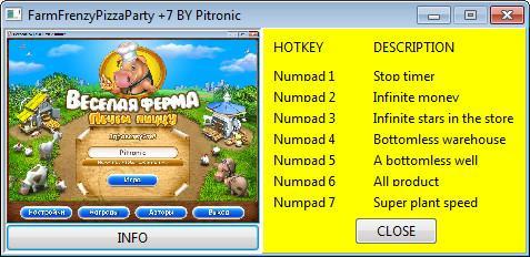 Farm Frenzy Pizza Party Просмотр файла Описание. Stop timer - остановить таймерInfinite money - бесконечные деньгиInfinite stars in the store - бесконечные звёзды в магазине улучшенийBottomless warehouse - бездонный складA bottomless well - вода в колодце не кончаетсяAll product - все продукты на складе (необходим чтоб работали заводы, чтобы сработал загляните в грузовикSuper plant speed - моментальная выработка продуктов заводами Добавил LIRW Добавлено 04.09.2020 Категория Трейнеры для PC игр
