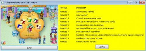 Pet show craze Просмотр файла Описание: 1) заморозить таймер2) много денег3) Станки не изнашиваются4) всегда активный бонус и не нужно комбо5) на ковриках клиенты всегда6) рекламный буклет со стола не исчезает7) всегда полный кофейник? быстрое прохождение уровня (достаточно обслужить одного клиента)9) разблокировать все уровни (смысл чита в том что если разблокировать все уровни, можно в магазине купить всё оборудование, а в доме Маши купить все улучшения. Осторожно чит глючный, когда его активируешь, сразу пойдут Квесты, не проходите их, выходите в меню-карта, пока не пропустите все Квесты иначе вылет игры, Квесты можно будет пройти потом)10) начать игру с начала Ps: Большое спасибо за помощь пользователям нашего форума Lirw и Garik66 Добавил LIRW Добавлено 04.09.2020 Категория Трейнеры для PC игр